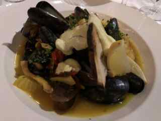 I had the Fisherman's Stew--$27. This had tomato, orange, fennel, saffron broth with aioli & crostini.